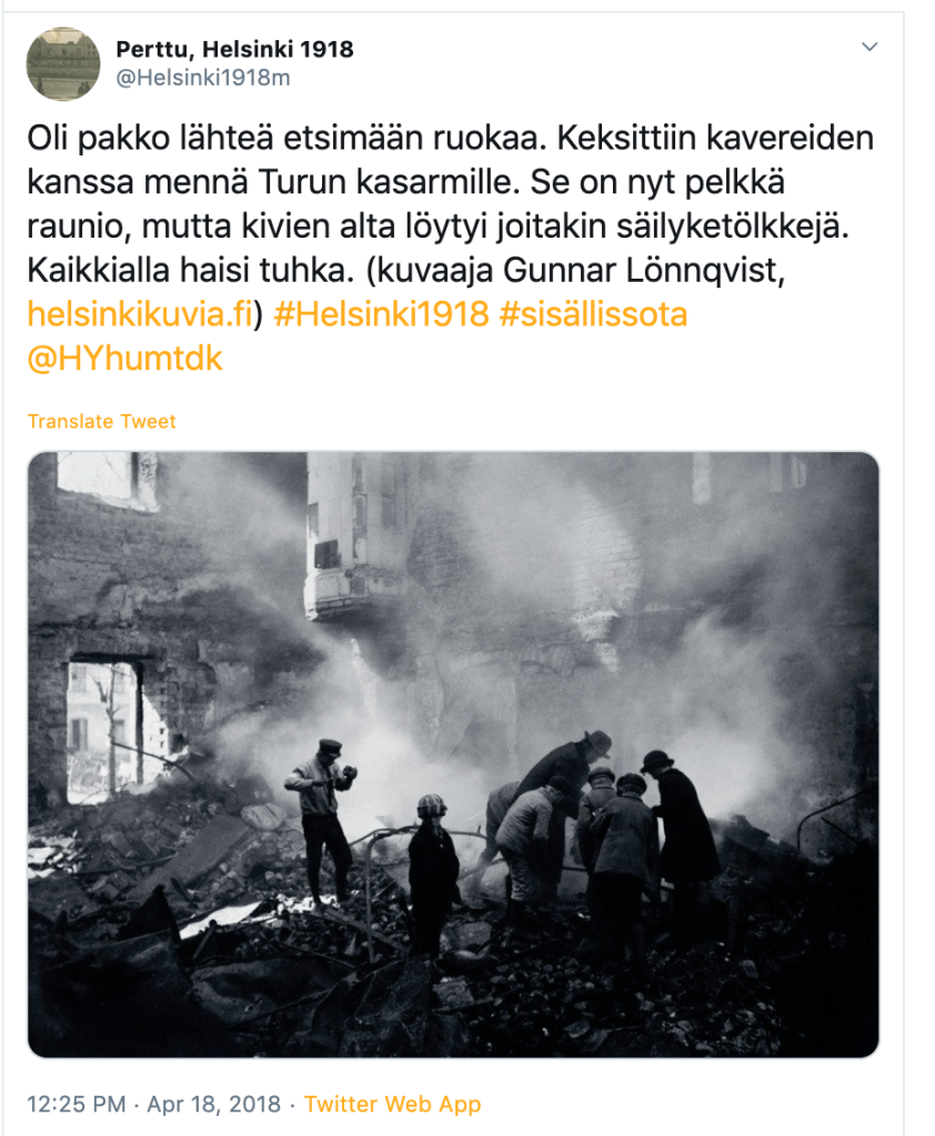 ”Helsinki 1918” -kurssilla luotujen twiittien tarkoituksena oli välittää historiallista tietoa Suomen sisällissodan tapahtumista ja mahdollistaa sisällissotaan eläytyminen kuvitteellisten Twitter-tilien kautta. Mielestäni tämä on äärimmäisen kiinnostava tapa ottaa osaa sosiaalisen median keskusteluun ja tuoda esiin tutkimukseen pohjautuvaa tietoa, vaikka twiitit olisivatkin kuvituksellisia. On silti tärkeää huomioida, että vaikka luotu käyttäjätili tai twiitit olisivat olleet täysin keksittyjä eivätkä esimerkiksi suoria sitaatteja alkuperäislähteistä, ne pohjautuivat opiskelijoiden taustatutkimukseen alkuperäislähteiden ja kirjallisuuden parista.