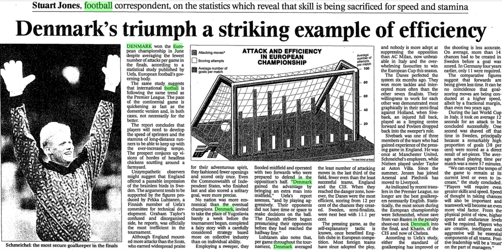 Jakson menneisyyden jälki valikoitui ensimmäisen yllätyksen kohdalta: ketkä ovat olleet miesten EM-kisahistorian yllättäviä voittajia? The Times kuvailee artikkelissaan vuodelta 1993 edeltävän vuoden EM-kisoja, jotka Tanska voitti. Artikkelissa kuvaillaan jalkapallon kehittymistä pelinä sekä ominaisuuksia, joita pelaajilta odotetaan. Siinä kuvaillaan niin ikään tilastoja ja analytiikkaa vuoden 1992 kisoista muun muassa Tanskan ja Englannin osalta.