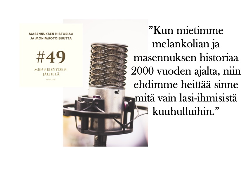 Shortly in English: Melancholy, depression, feeling blue. November is a great time to talk about the history of depression and all the colours of the phenomena we nowadays call as depression. The guest of the episode is cultural historian Annastiina Mäkilä, who has studied depression in the context of studying medicine, psychology and psychiatry in 1980’s and 1990’s University of Turku, in Finland.