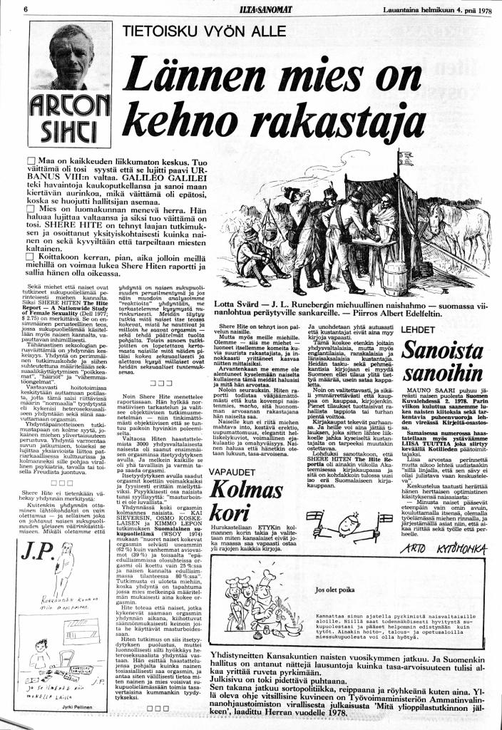 Arto Kytöhonka: ”Tietoisku vyön alle: Lännen mies on kehno rakastaja”. Ilta-Sanomat 4.2.1978.