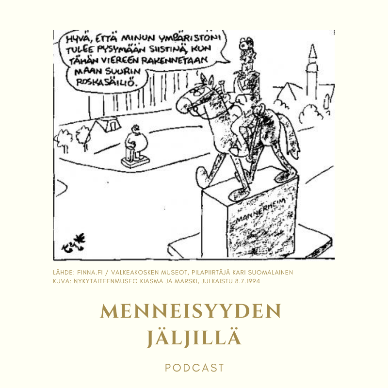 Samalla keskustelemme jaksossa erilaisista muutoksista suomalaisten identiteetistä erityisesti omaa menneisyyttä koskien. Tämän keskustelun yksi ruumiillistuma oli vuoden 1994 keskustelu nykytaidemuseo Kiasman rakentamisesta Mannerheimin patsaan viereen Helsinkiin. Nykytaide leimattiin edustamaan juurettomuutta ja historiattomuutta, kun taas Mannerheimista ja hänen patsaastaan kiillotettiin itsenäisyyden ikiaikaisten arvojen ilmentymä. Alla oleva Kari Suomalaisen pilapiirros tuo esiin tuon keskustelun näkökulmaa.