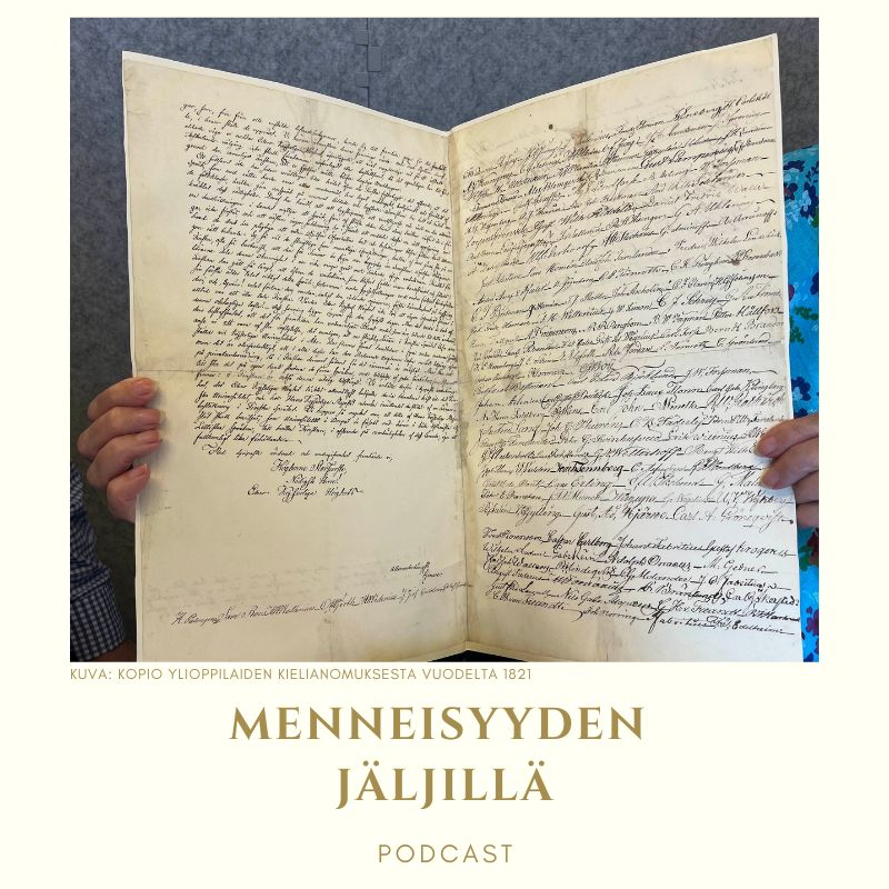 Jakson menneisyyden jälkenä on mielenkiintoinen sitaatti ylioppilaiden kielianomuksesta vuodelta 1821. Kuva tämän kielianomuksen kopiosta näkyy yllä olevassa kuvassa, joka on otettu jakson nauhoituksen yhteydessä studiolla. Katri toi studioon mukaansa kopion kielianomuksesta.