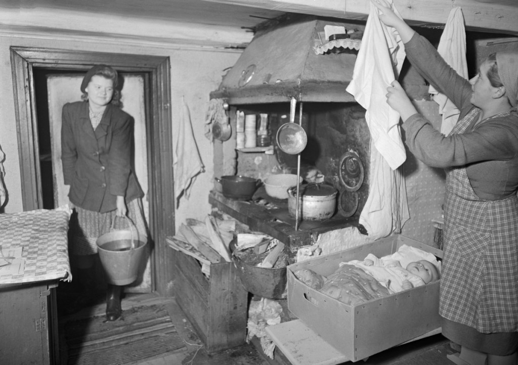 Yllä olevassa kuvaparissa näet kaksi vastaavaa sommitelmaa äitiyspakkauksista – vasemmalla vuodelta 1953 ja oikealla vuodelta 2024. Podcastin jaksossa vieraileva Jenni on sattumoisin itse raskaana jakson julkaisun aikana, ja hän asetteli aivan erinomaisesti vuoden 2024 äitiyspakkauksen sisällön vastaamaan verrokkikuvaa noin 70 vuoden takaa.